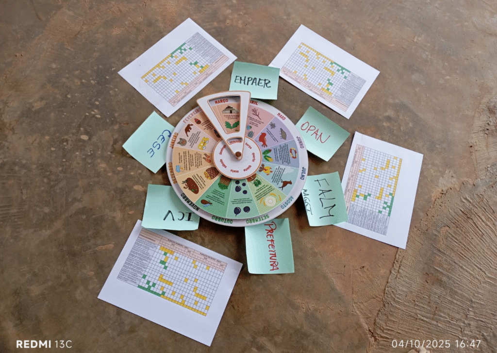 Foi realizada uma dinâmica participativa para revisar o calendário do projeto, considerando os fatores internos e externos que impactam a execução. “Com esse exercício, buscamos alinhar o planejamento às realidades do território e fortalecer a autonomia da associação na gestão dos recursos e na prestação de contas”, explicou Rochele.