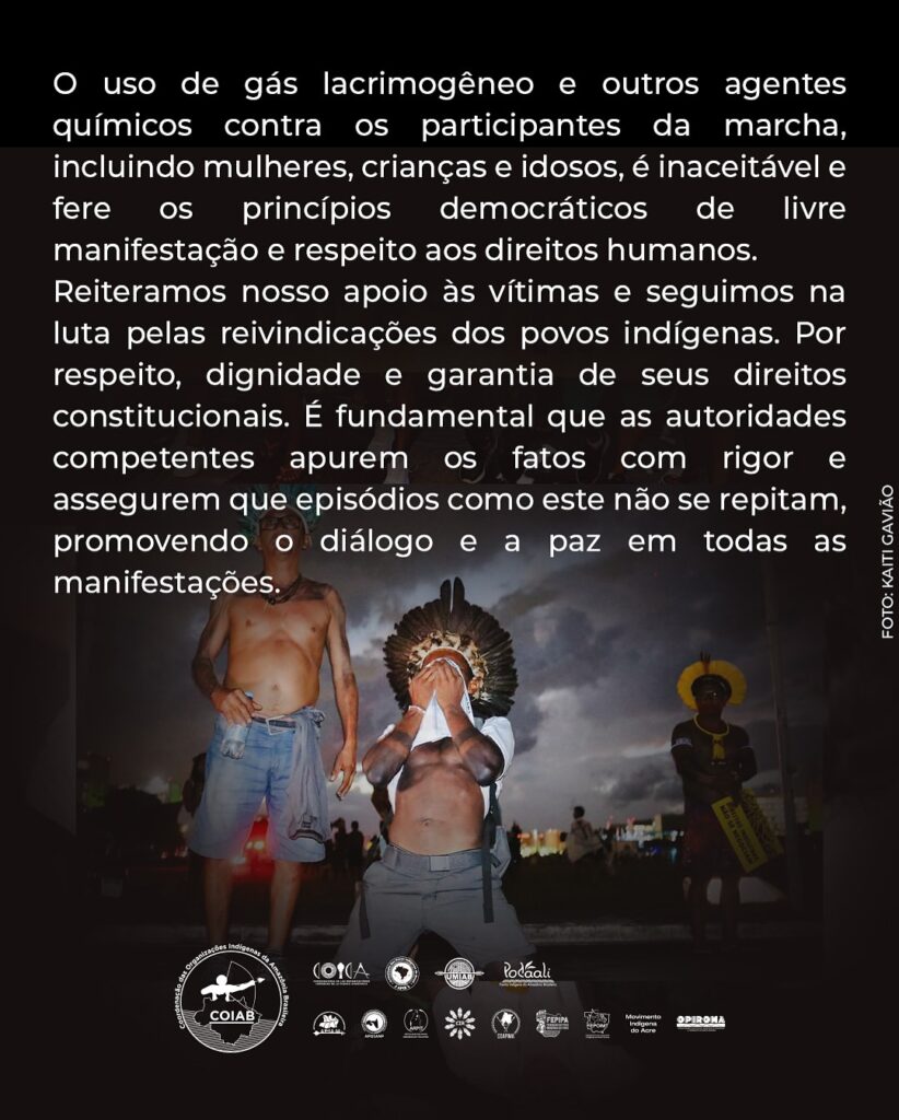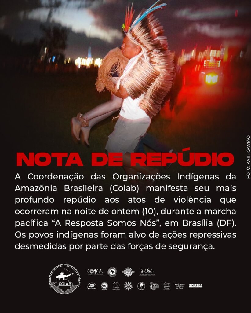 A Coordenação das Organizações Indígenas da Amazônia Brasileira (Coiab) manifesta seu mais profundo repúdio aos atos de violência que ocorreram na noite de ontem (10), durante a marcha pacífica “A Resposta Somos Nós”, em Brasília (DF). Os povos indígenas foram alvo de ações repressivas desmedidas por parte das forças de segurança. O uso de gás lacrimogêneo e outros agentes químicos contra os participantes da marcha, incluindo mulheres, crianças e idosos, é inaceitável e fere os princípios democráticos de livre manifestação e respeito aos direitos humanos.